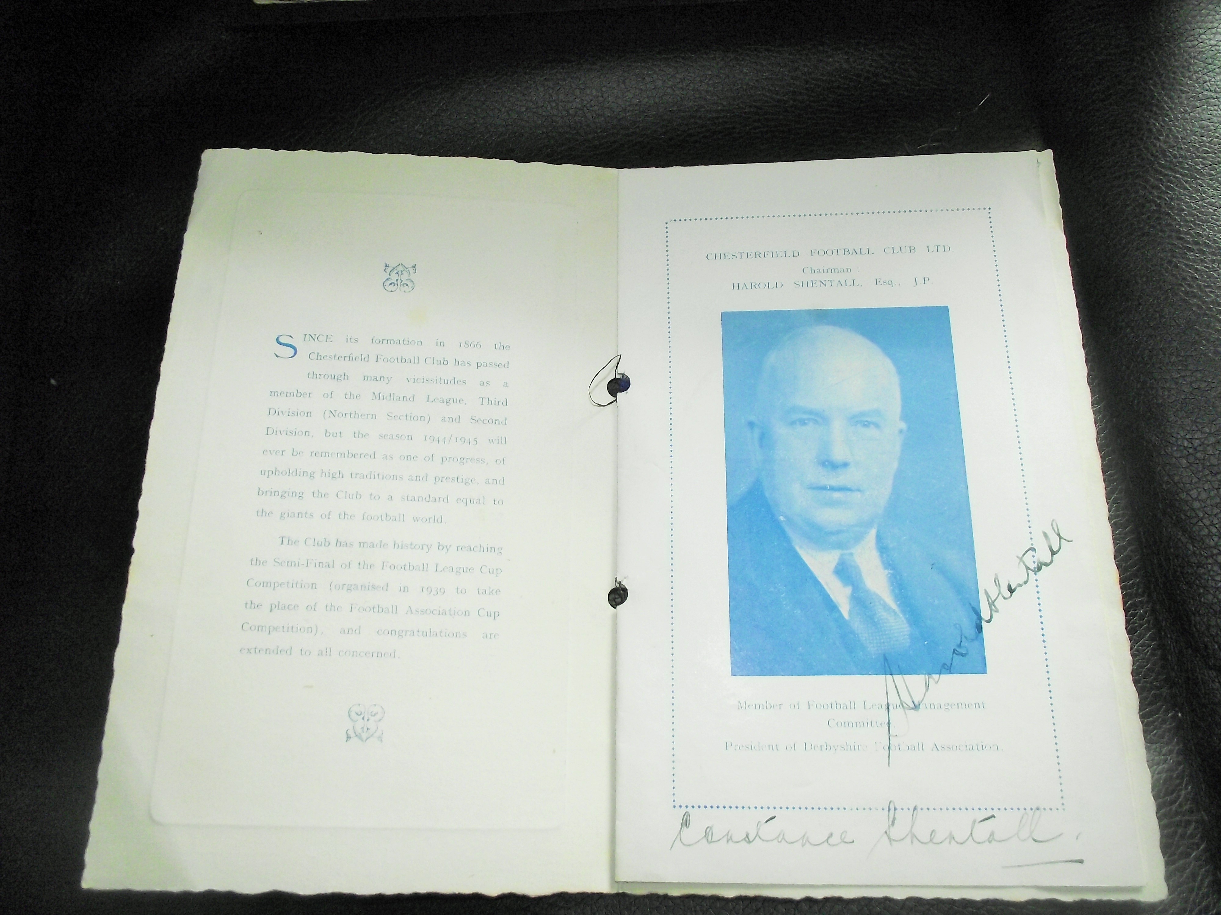 24th may 1945 chesterfield football club complimentary dinner invite signed by chairman harrold shentall and wife constance . Also signed in back by team players of the time