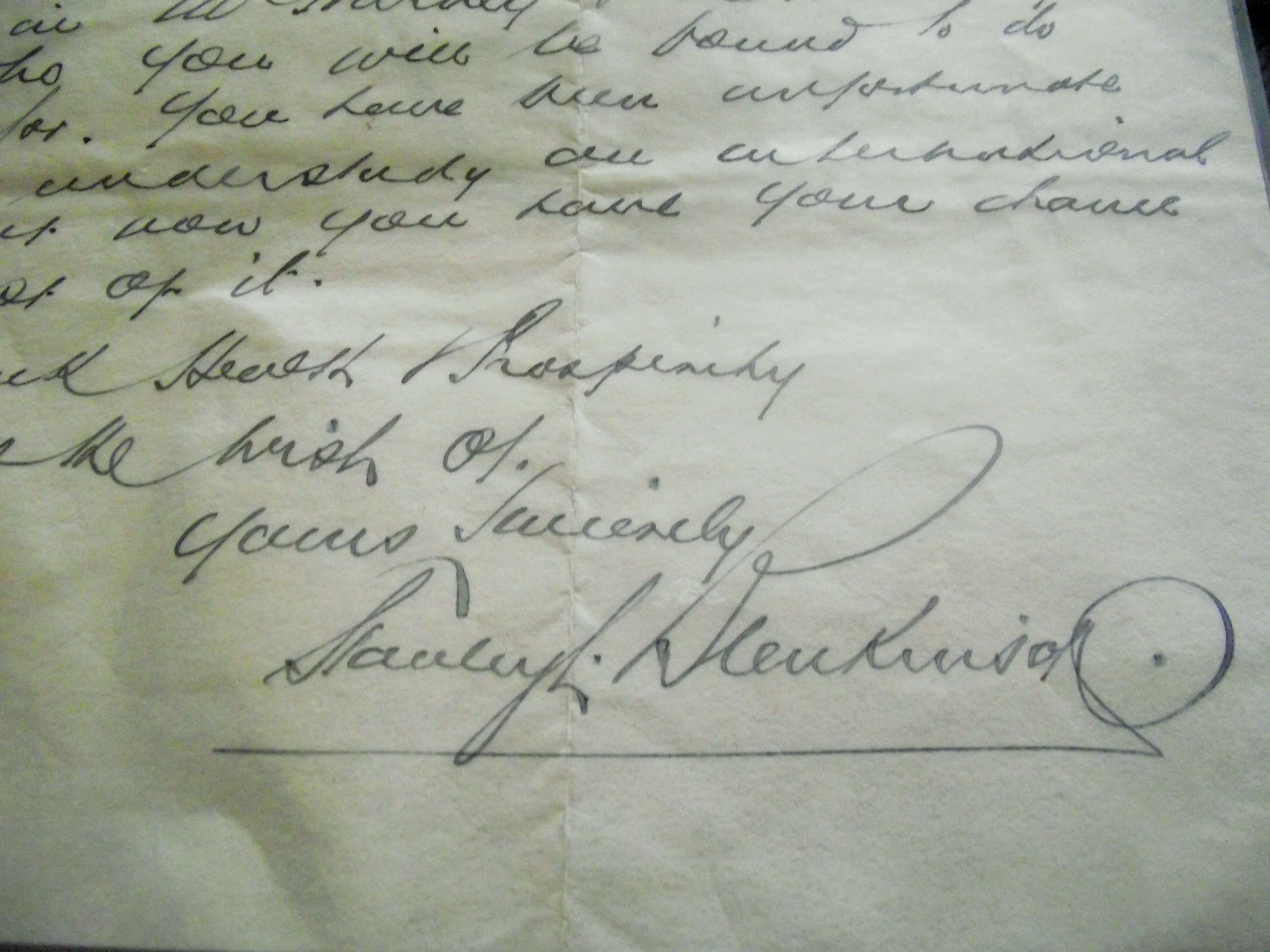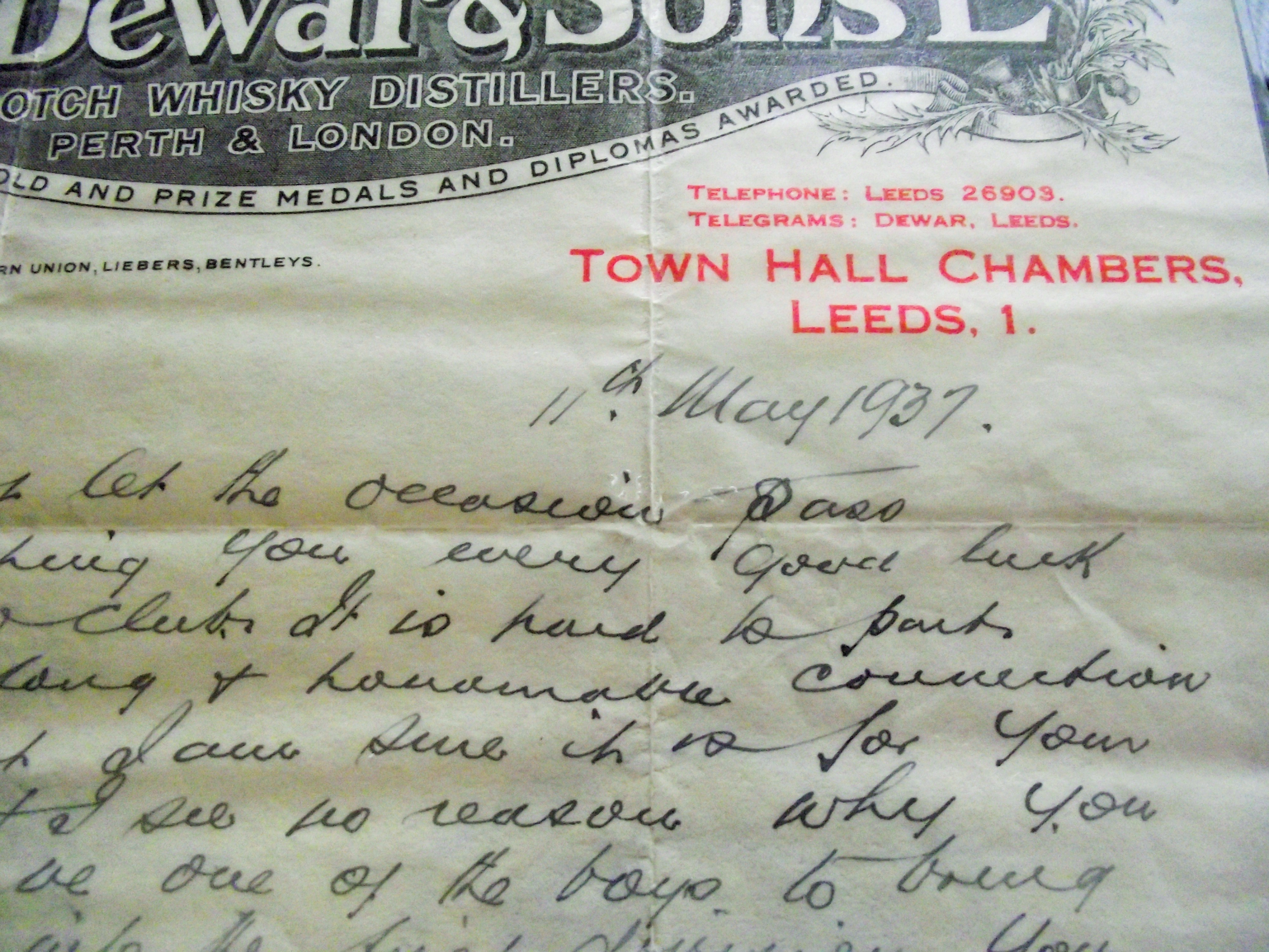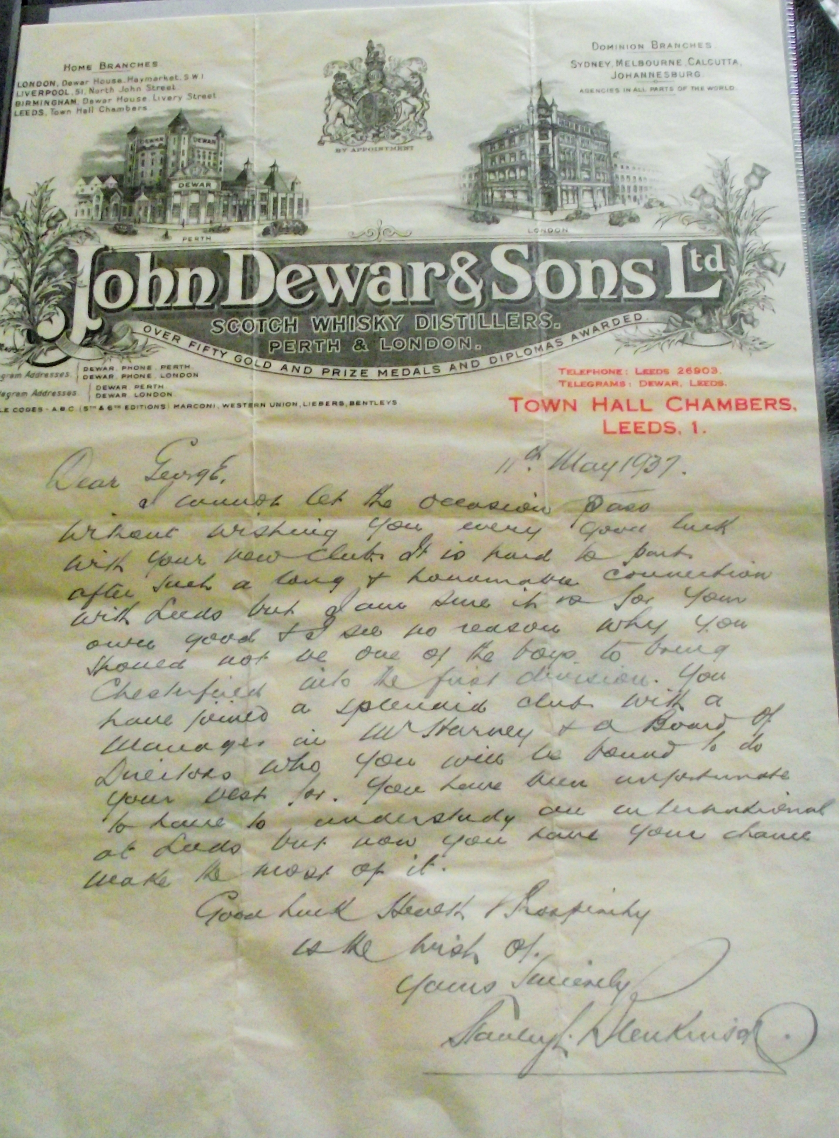 Rare possibly museum piece Letter to George ( millburn Leeds united & Chesterfield ) from Stanley blenkinsop Director of Leeds united wishing him all the best when transfering to chesterfield signed & dated 1937