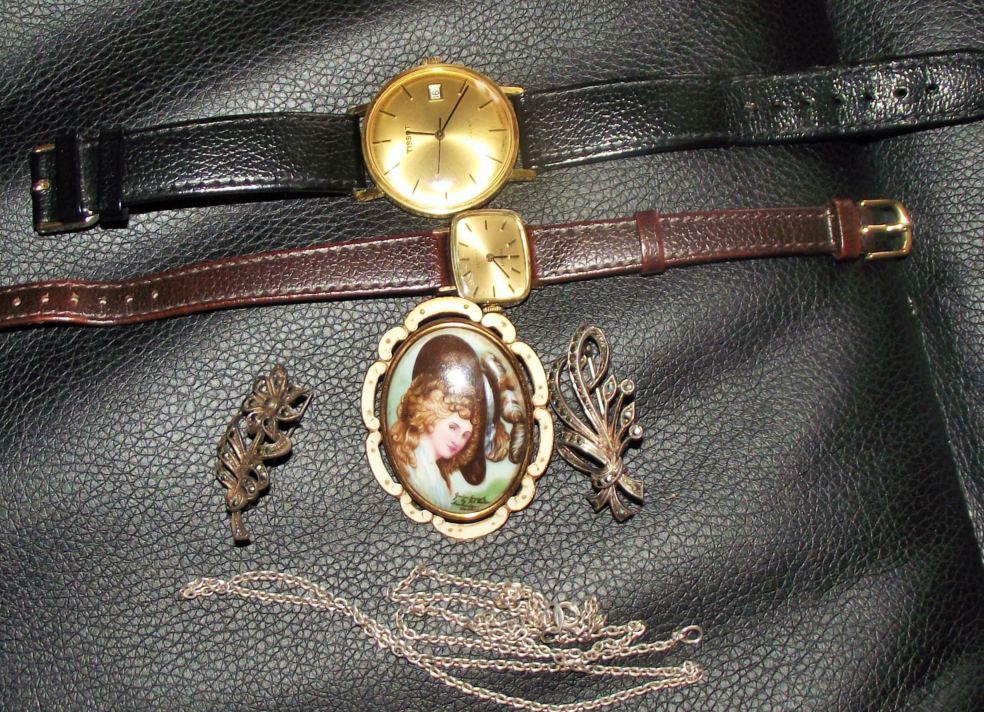 ladies and gents 1970 Tissot watches + silver chain + 2 silver diamante brooches + metal backed enamel portrait brooch