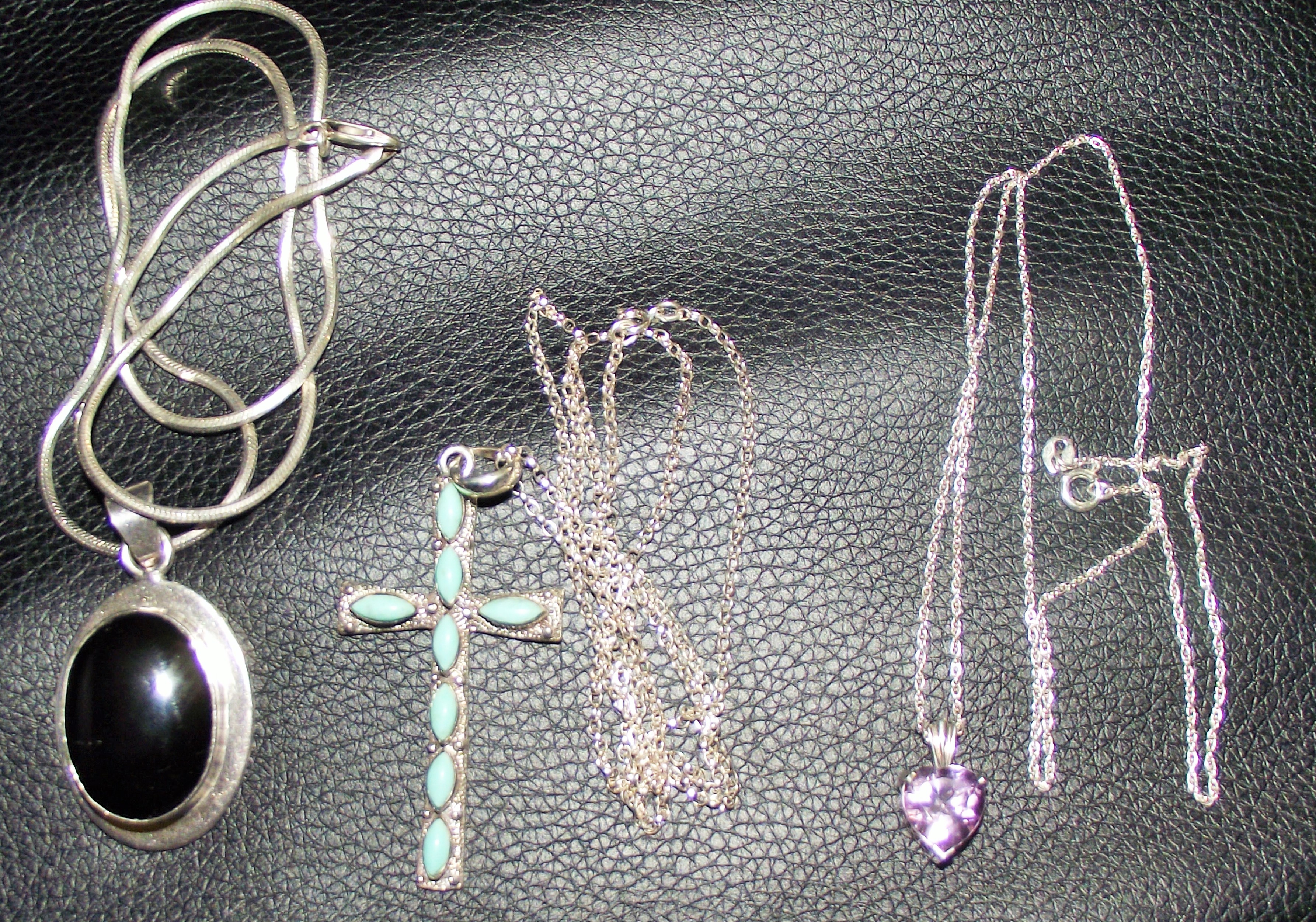 3 x ladies chains 7 pendants all marked 925 , Cross set with Tourqouise stone , heart pendant set with amathyst coloured stone , oval pendant set with black hardstone 42g approx