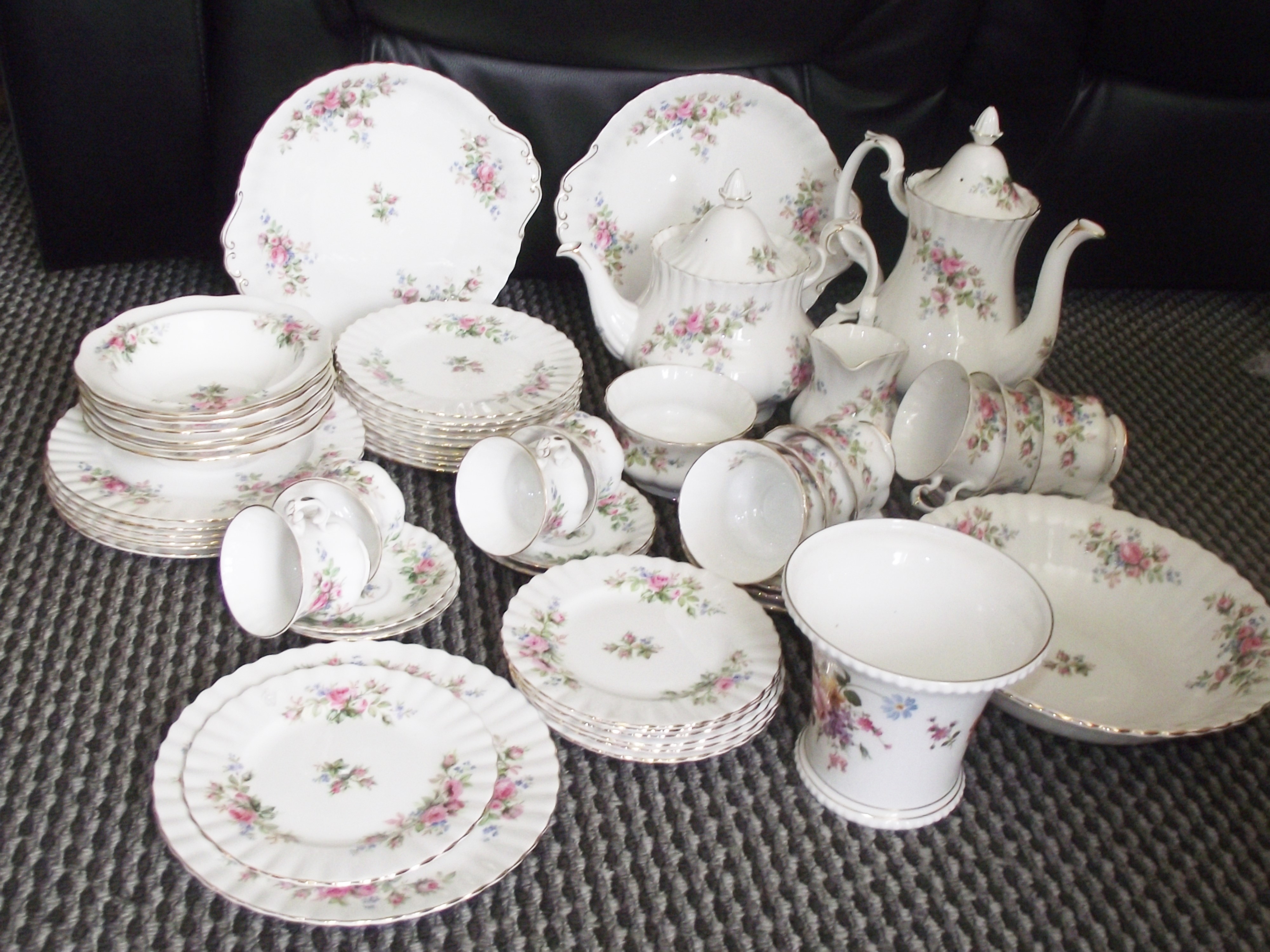 large collection of 56 pieces Royal albert Moss rose tea/ coffee wares , fruit bowls , vase etc
