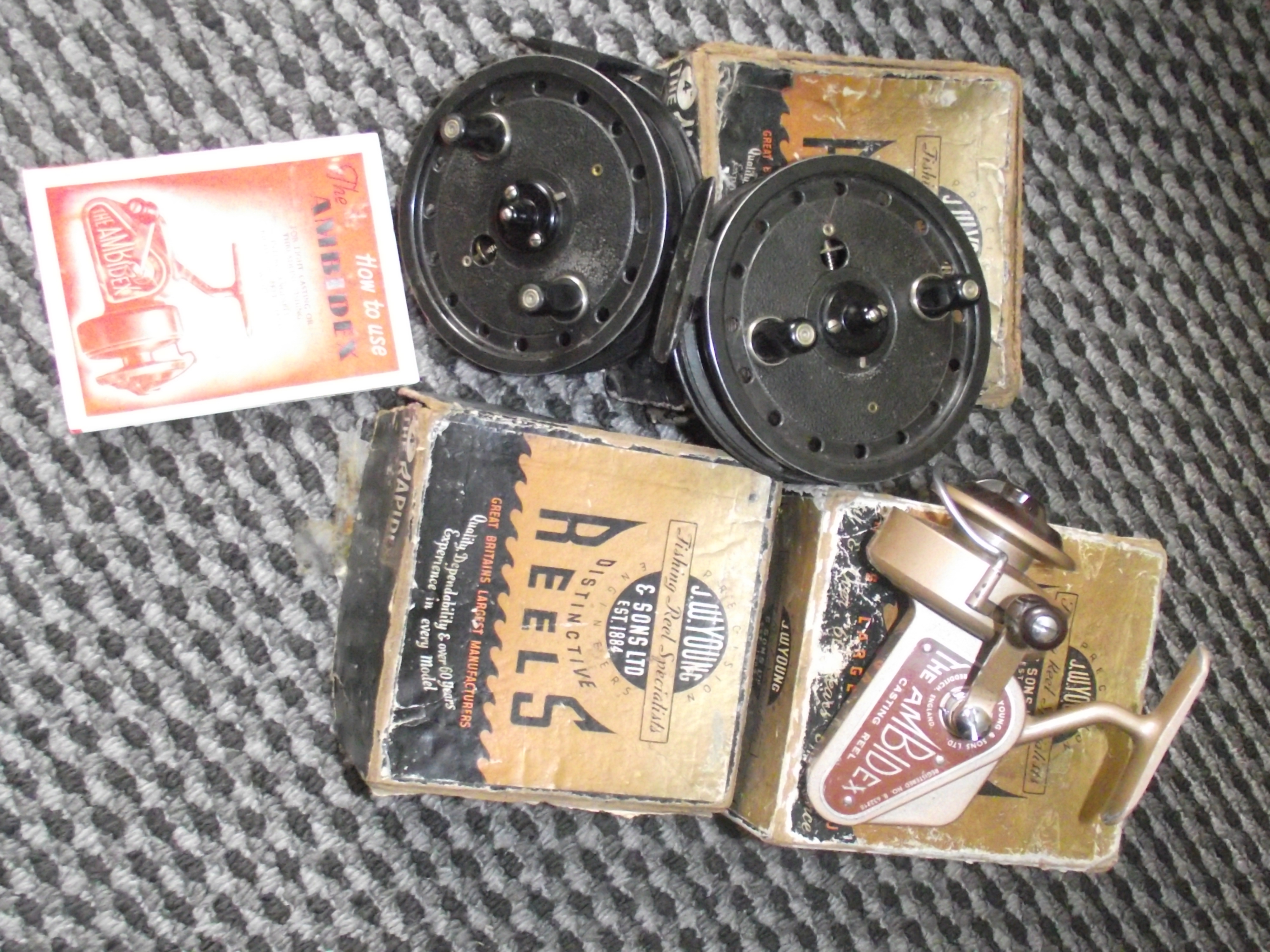 3 x vintage fishing reels ( 2 x j w young 1950s/60s rapidex 843417 fishing reel 4″ diam +1 x j w young 1950s/60s the ambidex threadline spinning reel all with original boxes