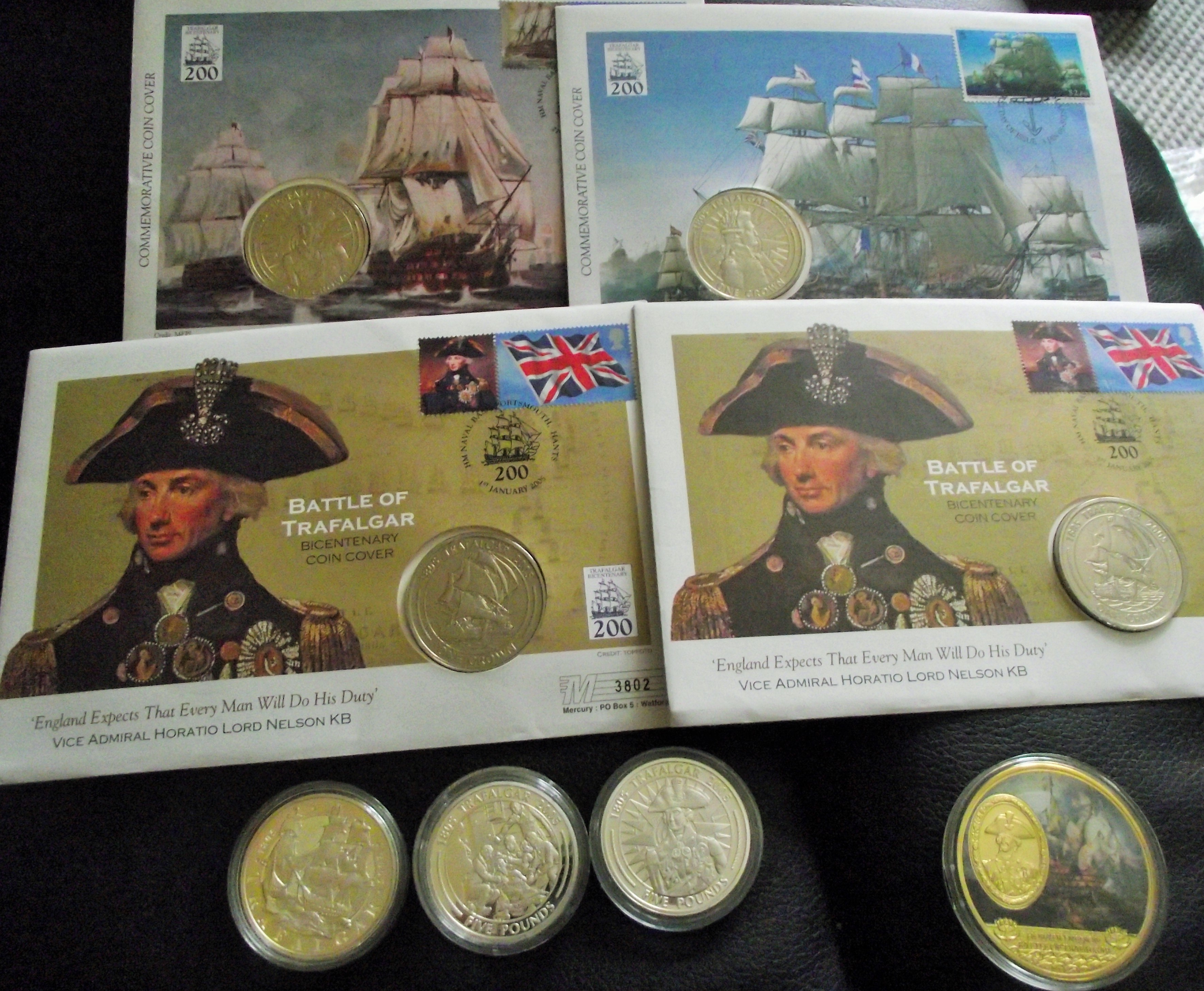 3x 2005 Trafalgar £5 pound coins in sealed cases + 1 x 2014 250TH ANNIVERSARY HMS VICTORY BATTLE OF TRAFALGAR 24K LAYERED + 4 x 1st day commemorative Nelson /Trafalgar covers with coins