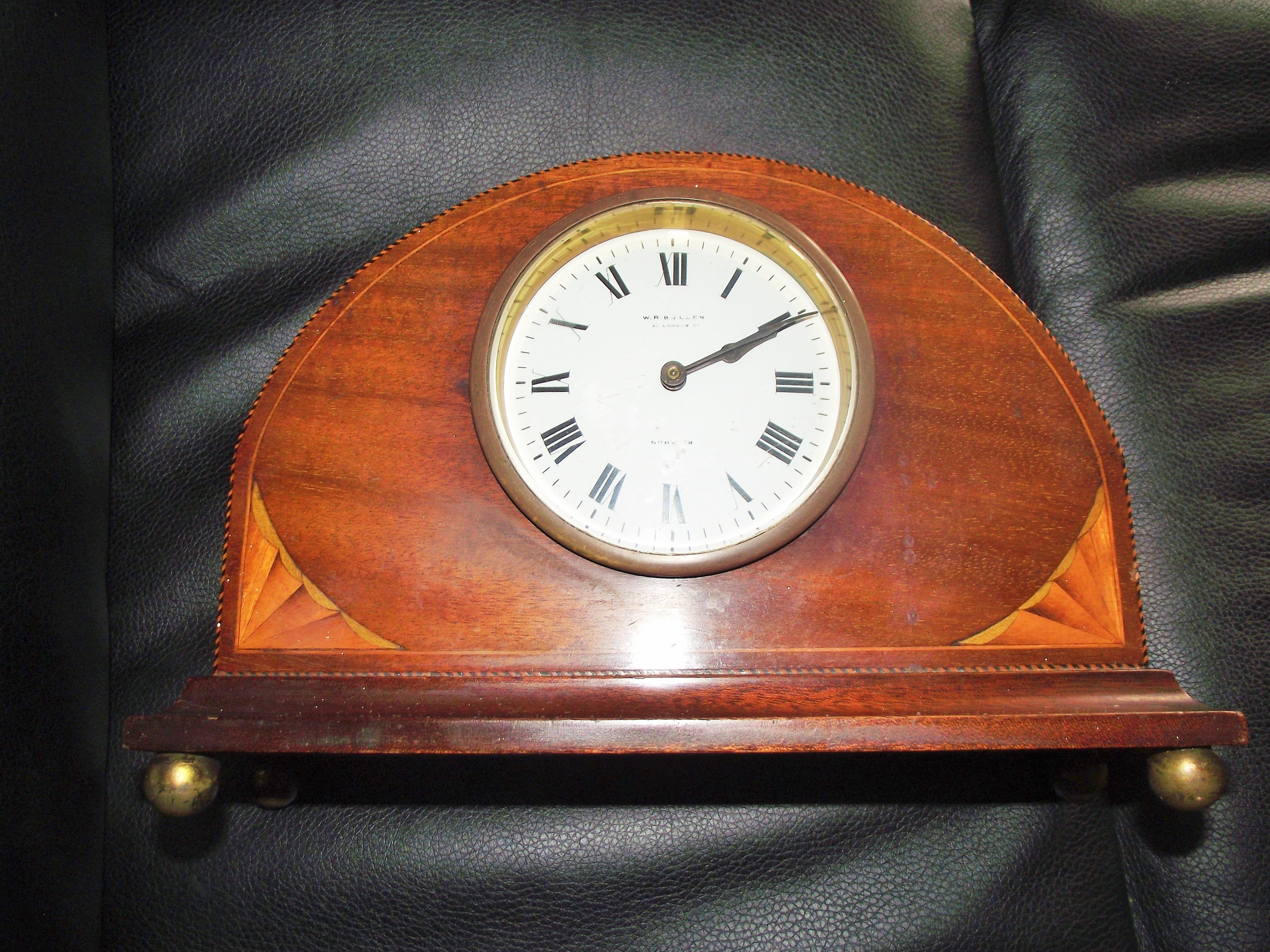 Mahogany Inlaid Art Deco mantle clock raised on brass bun feet dial signed for retailer W R BULLEN London Norwich( Working up to when catalogued )with key
