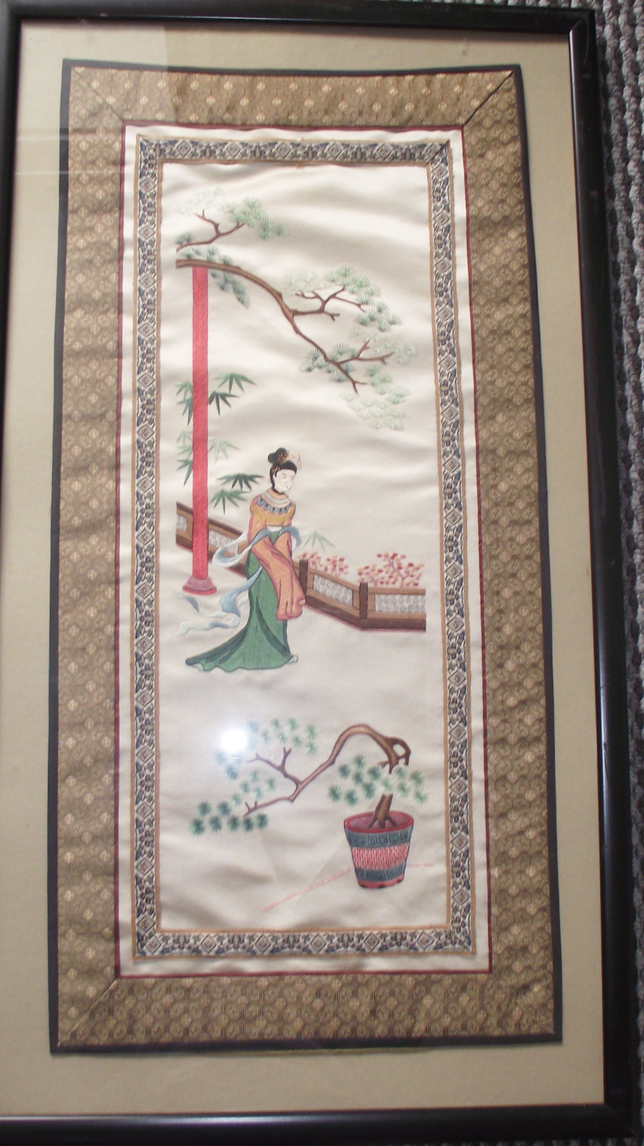 Large quality 19thC embroided silk stitched picture of a geisha girl in garden beautiful fine stitched detail with original borders 30×17″ framed