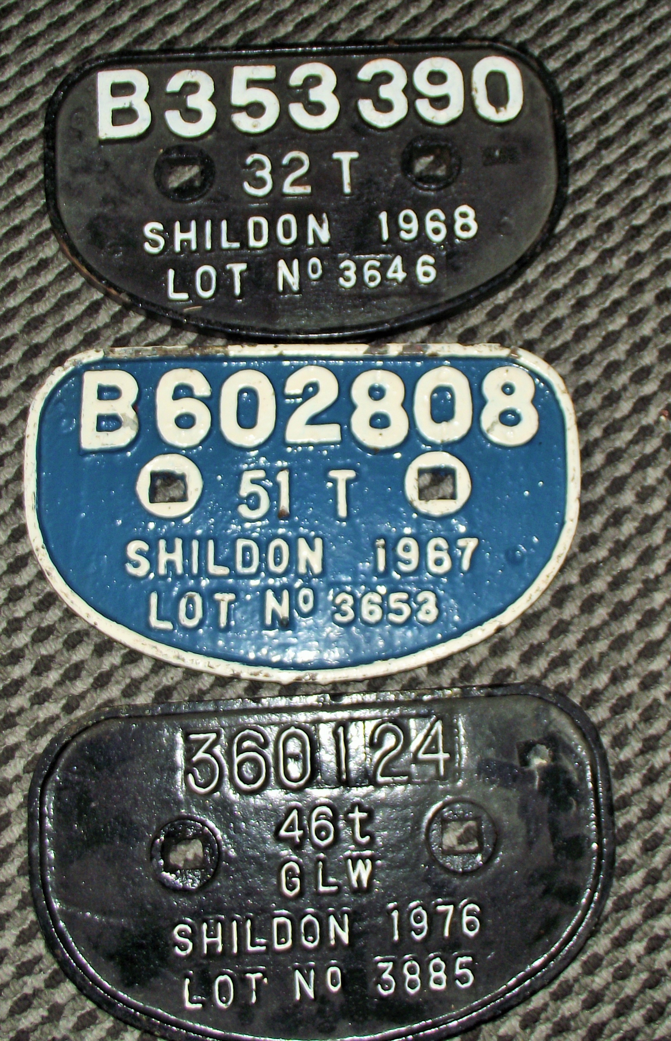 3x cast iron shildon railway wagon plates including blue painted wagon plate