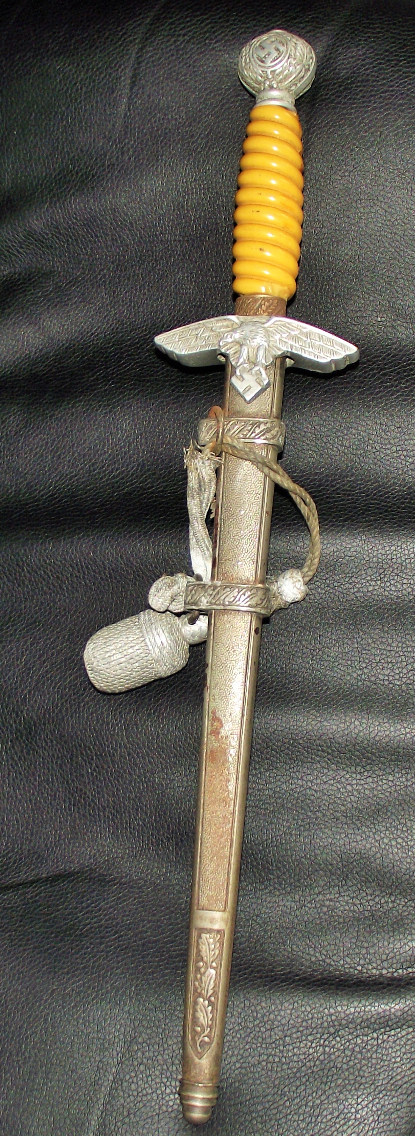 A German Third Reich Type Luftwaffe Dagger, Second Pattern, the steel blade etched with maker’s name Clemen & Jung , Solingen, the white metal alloy hilt, alloy pommel with orange plastic grip(damage to plastic grip and no wire grip , with pebbled white metal scabbard