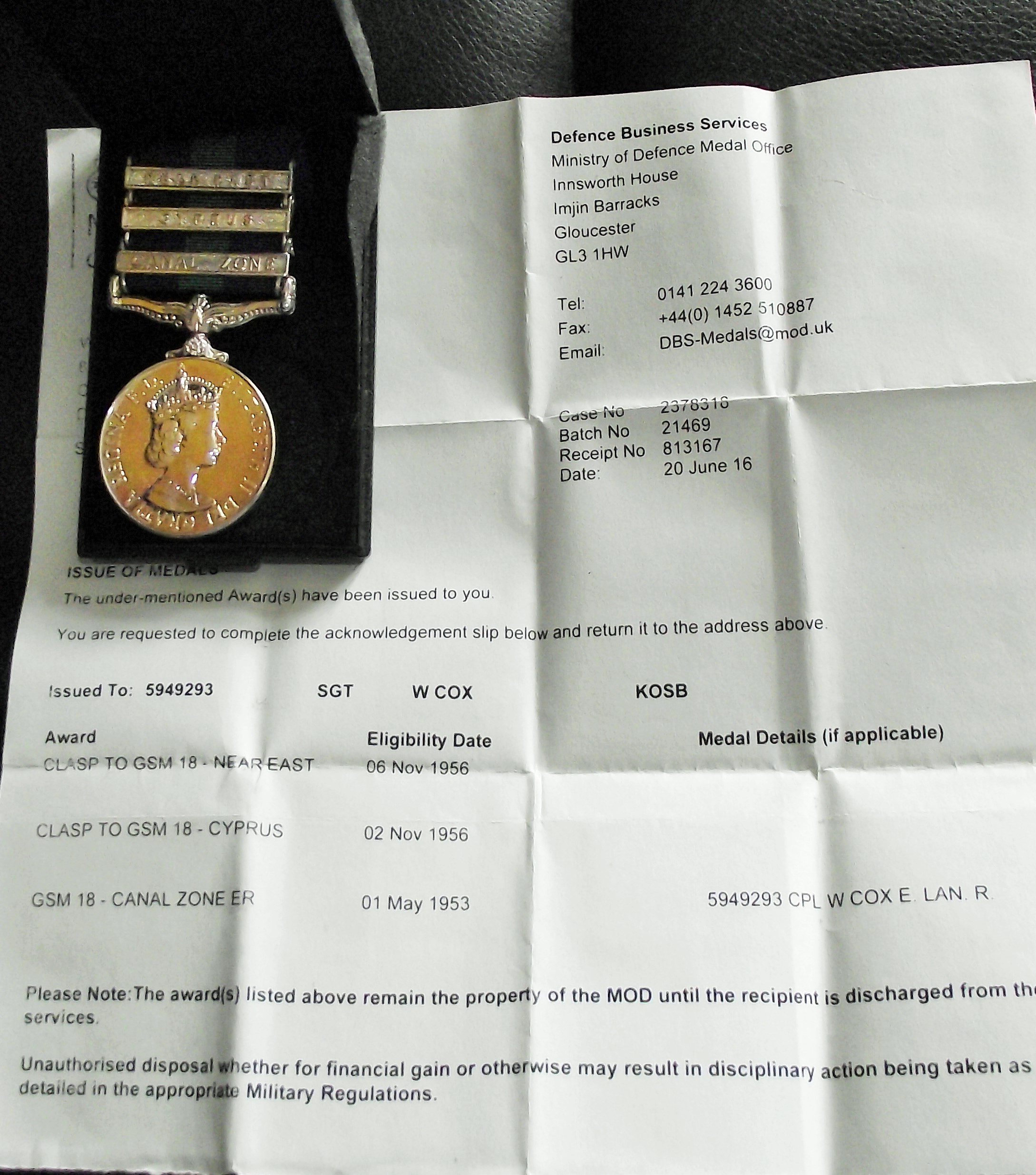 WW2 British general service medal with Near east , Cyprus , Canal zone claps inscibed on edge 5949293cpl W Cox E.lan.R with letter from ministry