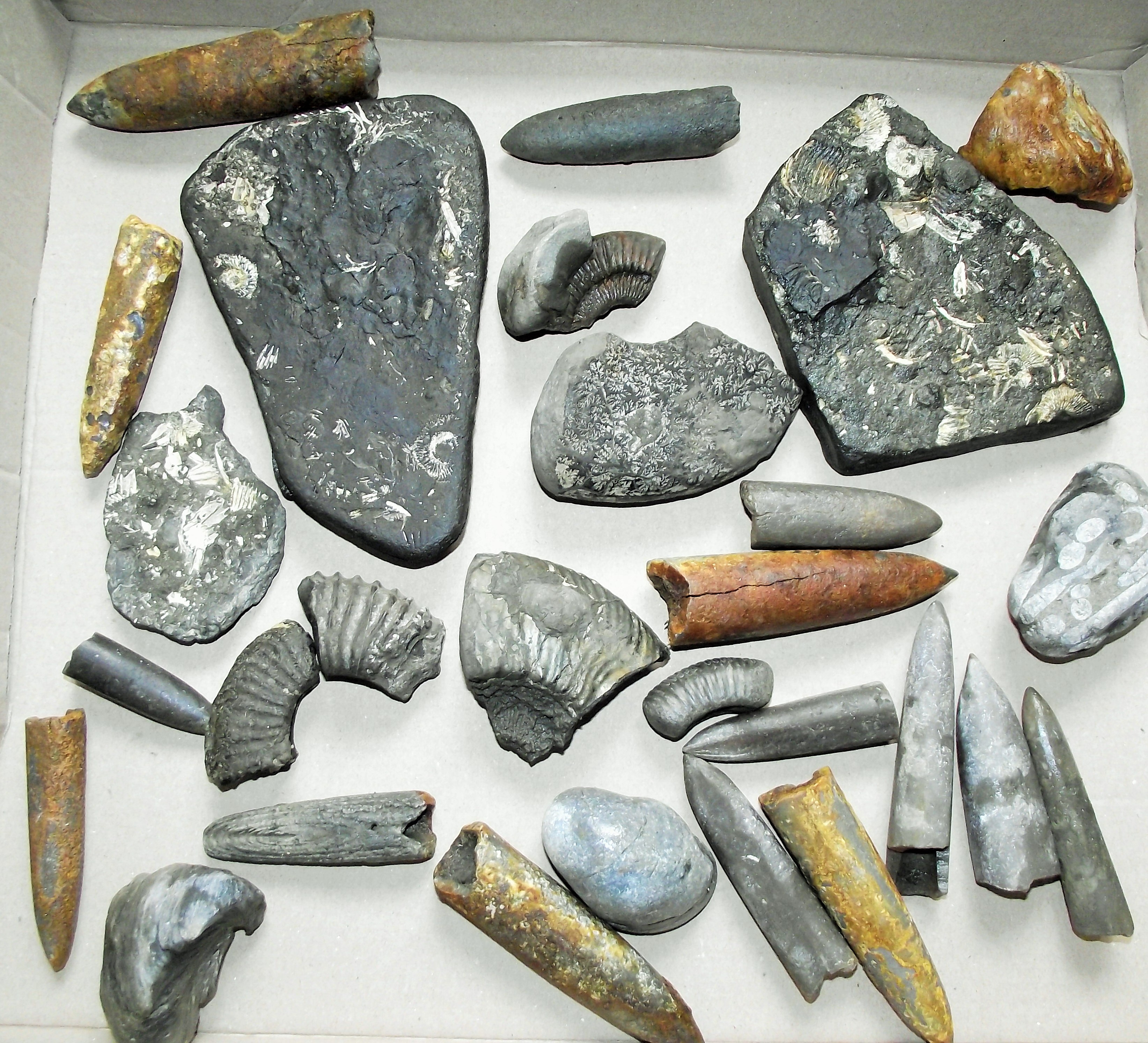 Good selection of fossils including Beleminites , part ammonites ,shells grasses plants etc