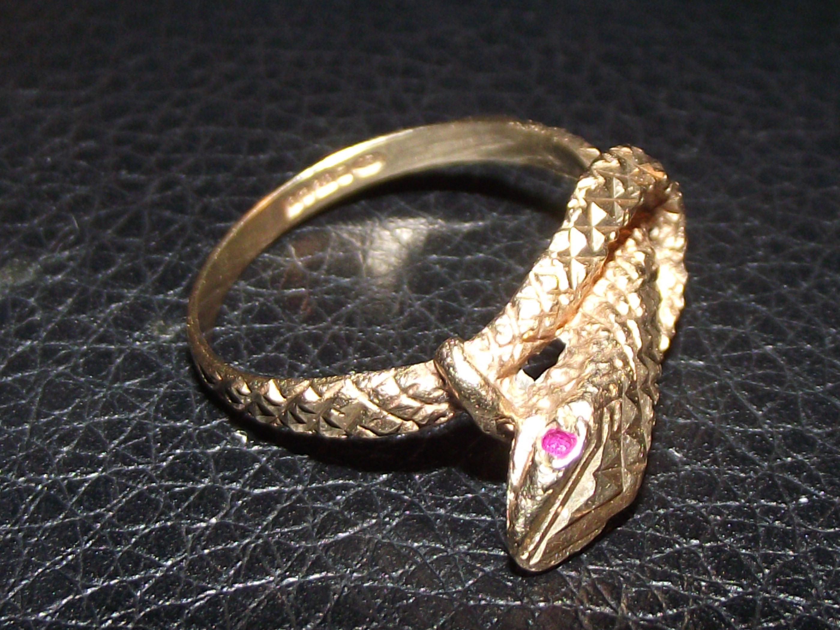 A vintage yellow gold serpent ring crafted in a bypass design, depicting a tightly coiled snake. The body and head of the serpent feature a highly textured, diamond-cut or pyramidal pattern intended to simulate scales, lending the piece a distinctive, tactile finish. The tail forms the plain, polished section of the shank. The head of the snake is set with a single, small, round-cut ruby, serving as the eye, displaying an intense magenta hue. This style is characteristic of late Victorian or early 20th-century jewelry revival pieces. Indistinct hallmarks or maker’s marks are visible on the interior of the shank, consistent with gold purity marks, though they are currently illegible.