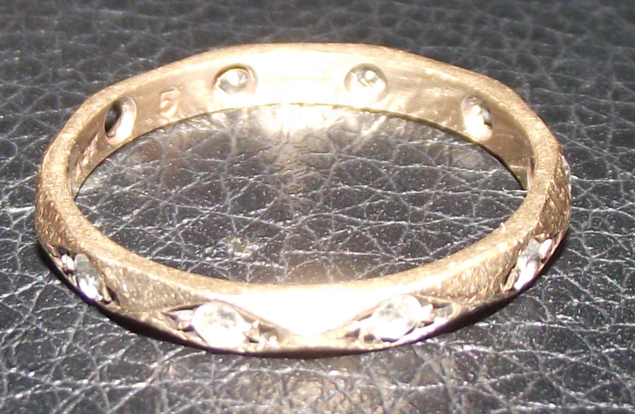 A narrow, vintage or antique half-eternity band ring crafted from a heavily patinated yellow metal, which appears to be gold based on color and style. The band features a textured or hammered surface finish and is channel-set across the face with small, colorless, round brilliant cut stones, presumed to be diamonds based on market comparables and visual characteristics. Approximately eight stones are visible, each mounted within a decorative lozenge or diamond-shaped section of the metal. The ring displays a classic Mid-Century or earlier design aesthetic. The interior shank features an open gallery design beneath the stones and is clearly stamped with the mark “5,” indicating the ring size.