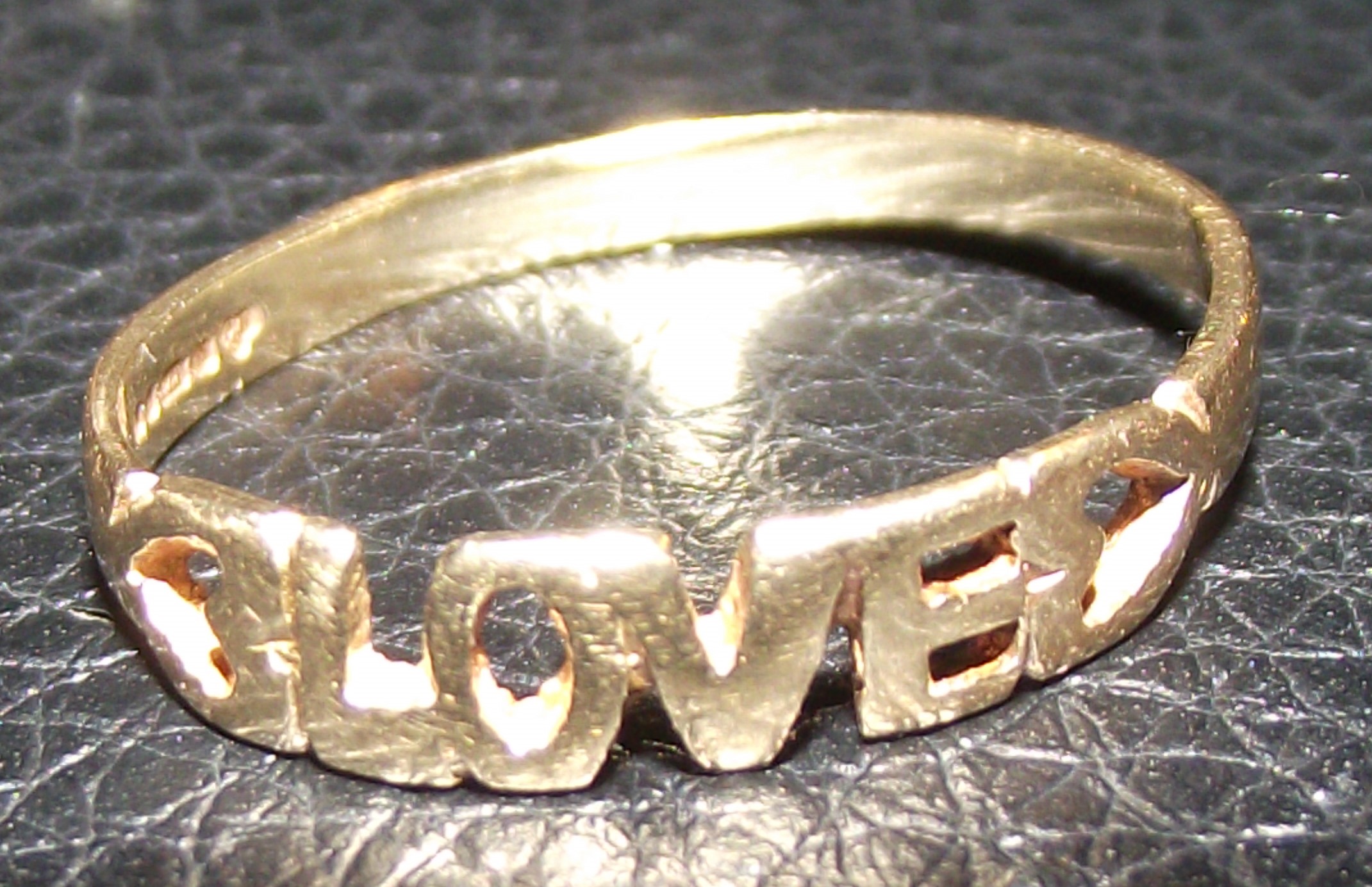 This sentimental ring is crafted in a gold-toned metal, featuring a flat band design where the word BELOVED is formed by cutout lettering across the face. This style of cutout word ring is commonly produced in 14k gold according to market comparables, though the specific metal purity of this item cannot be confirmed without professional testing. The ring contains no gemstones. The interior surface of the band bears a series of small, stamped hallmarks or maker’s marks which are currently illegible due to wear and magnification limitations.