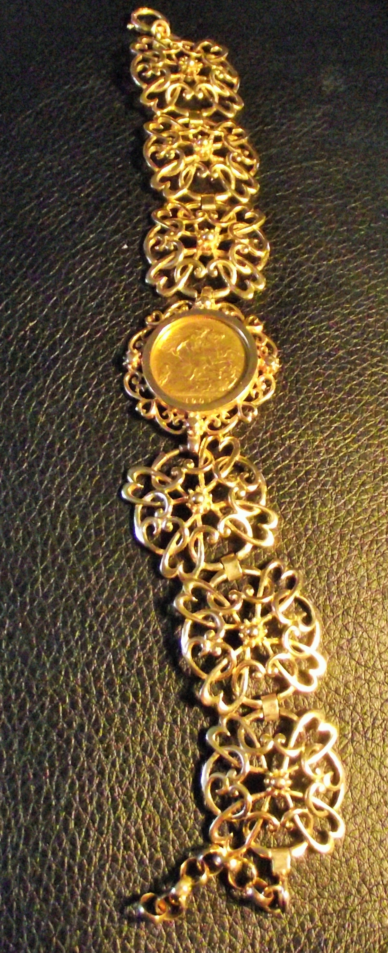 This articulated bracelet section, likely dating to the mid-20th century or earlier, features a highly ornate design reminiscent of Victorian or Edwardian revival styles. It is constructed of bright yellow metal, which appears to be gold-toned. The piece is composed of five interconnected, openwork links characterized by intricate scrollwork and stylized floral motifs, suggesting it may have been part of a larger ladies’ bracelet or watch chain. The central link is a large, oval bezel setting framing a circular, gold-toned token, coin, or medallion. The medallion bears an illegible relief image, possibly a portrait or crest. The design emphasizes decorative elegance over material value, consistent with high-quality vintage estate jewelry. No visible maker’s marks or purity hallmarks were observed upon inspection.
