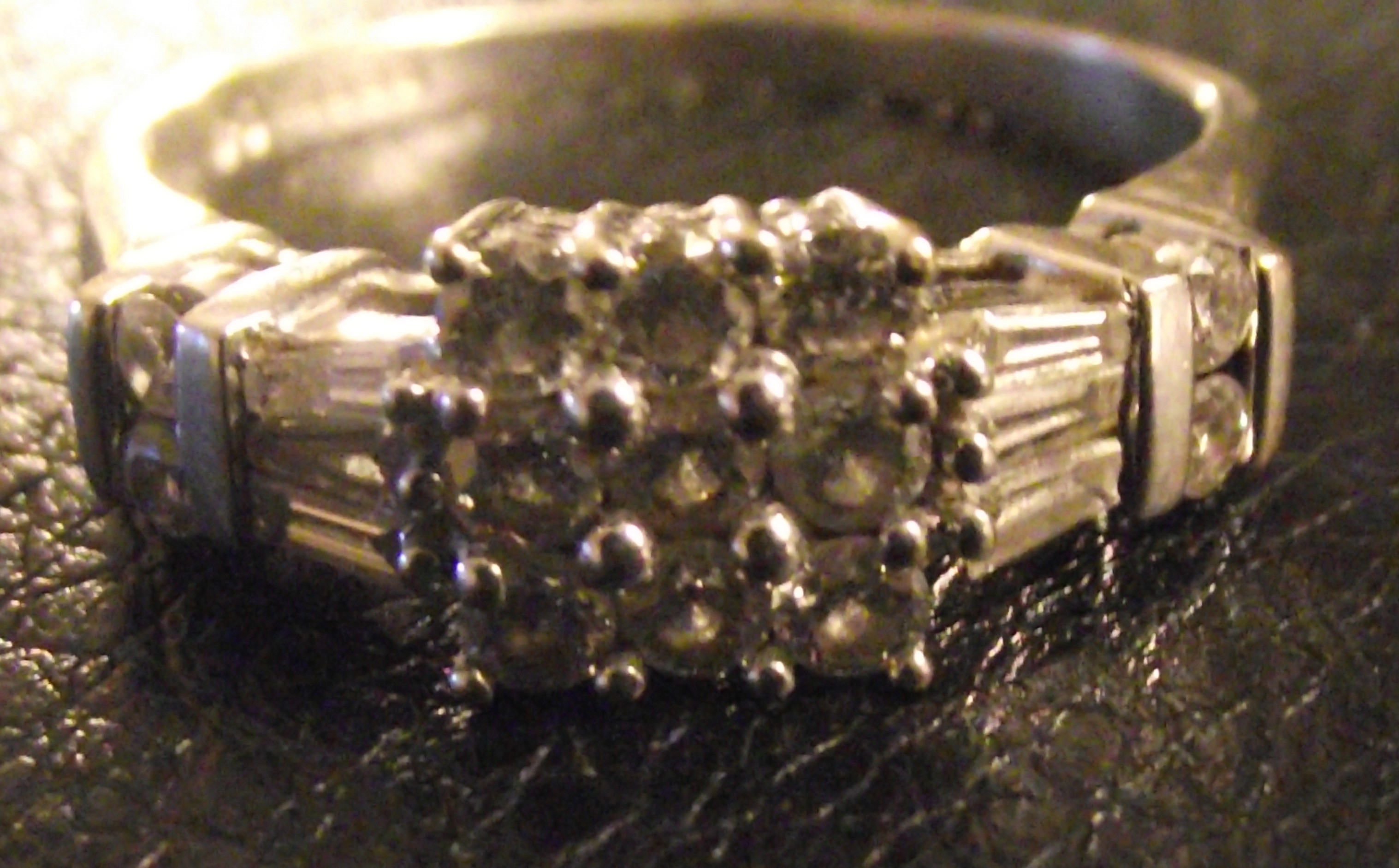 This dress ring features a geometric cluster design, characteristic of Mid-Century or Retro jewelry. The mounting is crafted from a reflective white metal, which is likely 14 karat white gold based on the strong market consensus for comparable items of this style. The head of the ring is centered by a rectangular cluster composed of nine small, colorless, round brilliant-cut stones set closely with bead prongs. The shoulders are accented by two horizontal baguette-cut colorless stones on each side, flanked by small round brilliant-cut stones, creating a strong, linear profile. The total estimated count is seventeen colorless stones. The colorless stones are presumed to be diamonds, consistent with the typical construction of this style of fine jewelry. No hallmarks or maker’s marks are visible due to the low resolution of the image.