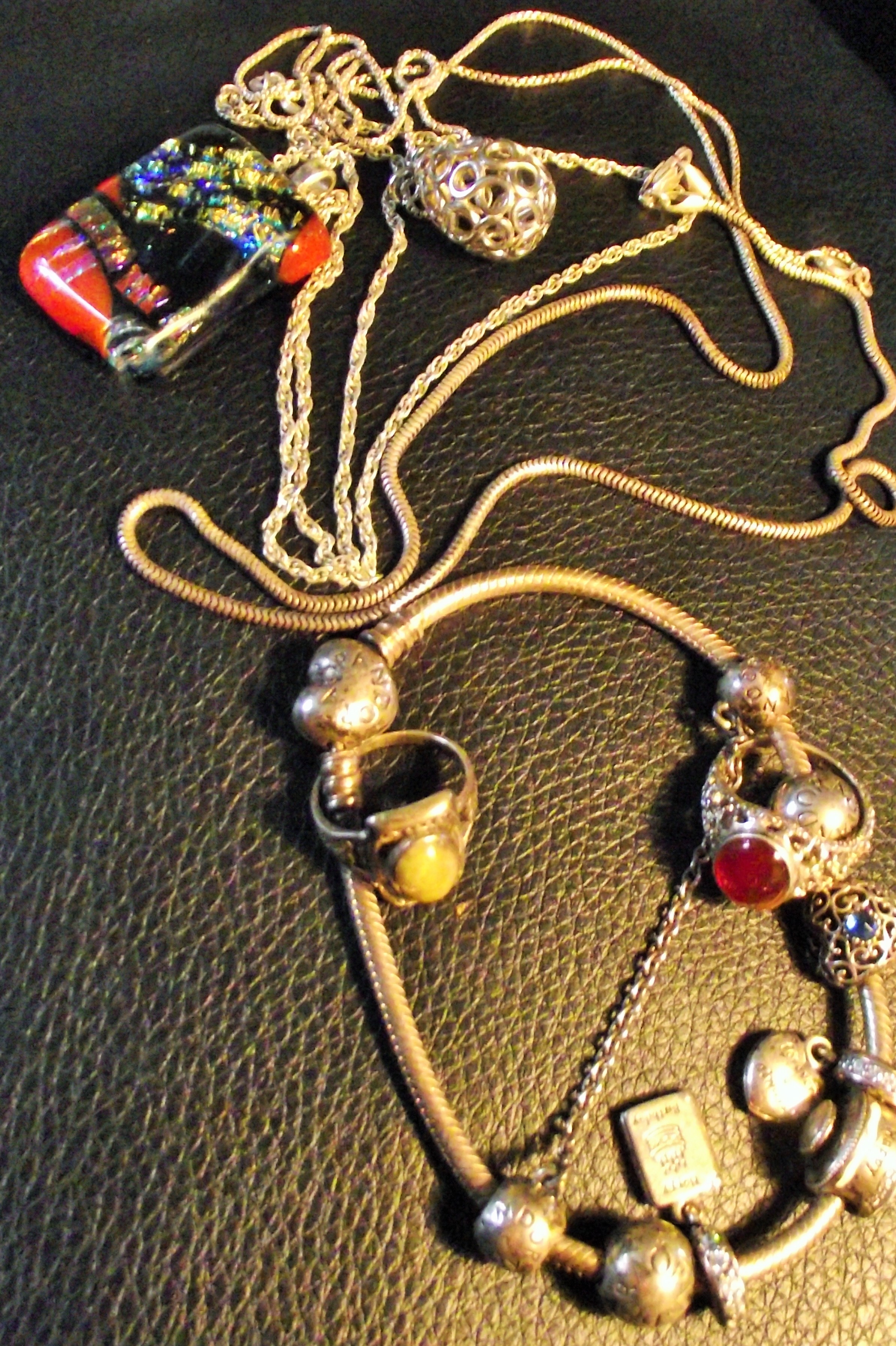 STEP 1 – ENUMERATION: Item 1: Modular Charm Bracelet. Item 2: Silver-tone rope chain necklace with two pendants. Item 3: Gold-tone snake chain necklace.